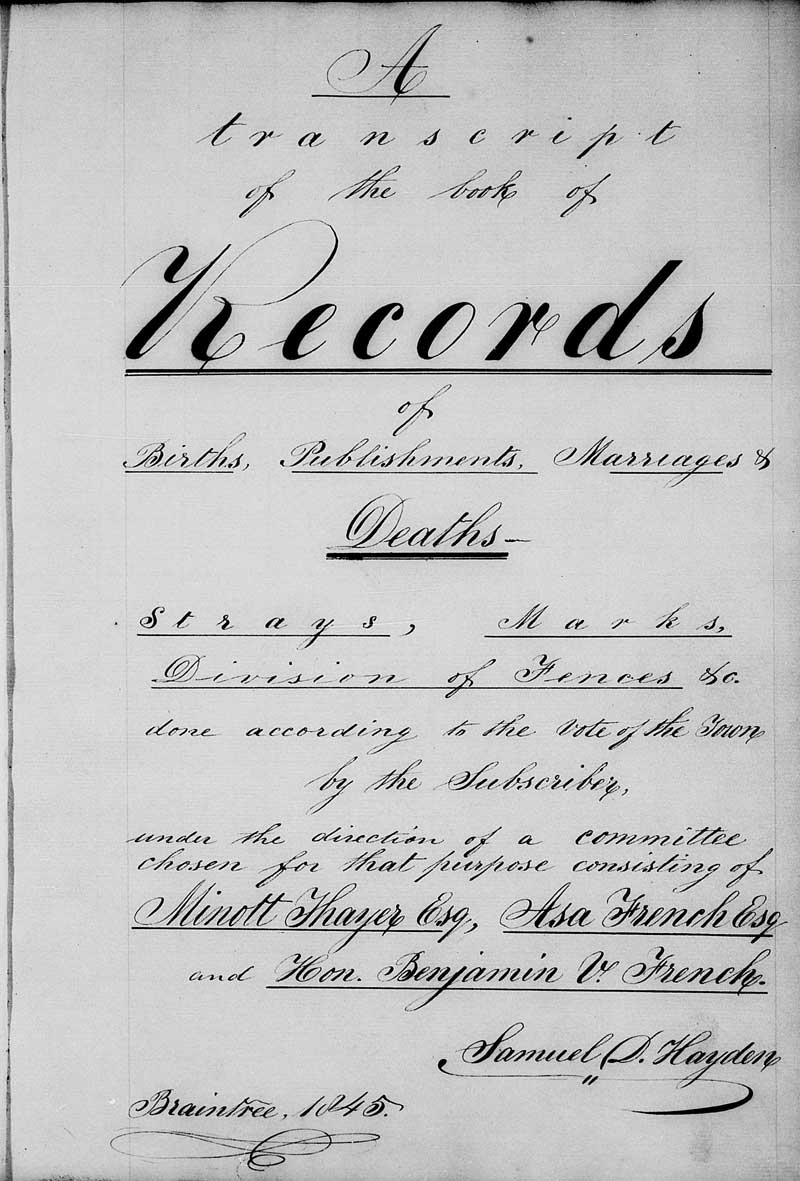 So what do we have here? Something is not quite right. Flipping back (digitally) to the title page of the book reveals that the entire book is a transcription, authorized by the town, and completed in 1845. It is not an original record. (The handwriting might have been another clue that this was not written in 1767.)